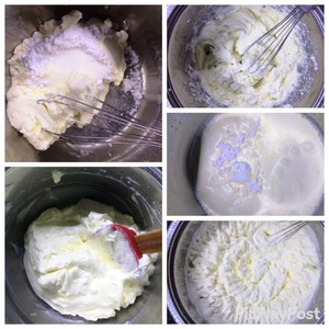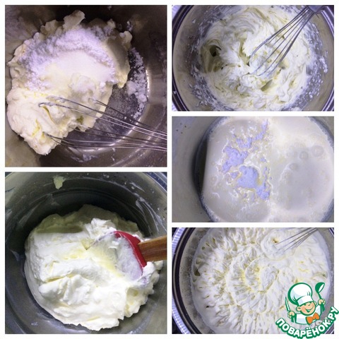 Крем готовится очень легко и быстро. Взбиваем охлажденные сливки с сахарной пудрой. Также взбиваем сливочный сыр с сахарной пудрой. Затем их объединяем и еще немного взбиваем.. Крем готов. Сладость крема точно можно регулировать по своему вкусу, т. к. зависит еще и от ягод, которые будете использовать в торте. Я оставила немного крема, которым потом обмазала для пропитки торт.