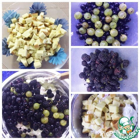 Как писала уже выше, бисквит нарезаем кубиком. Ягоды моем, чистим, если есть хвостики. Если это вишня, вынимаем косточки.