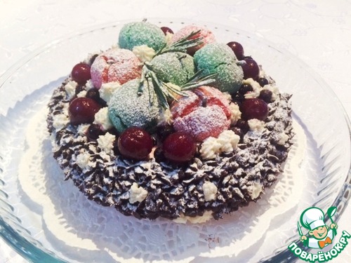 Украшаем торт по своему желанию. Можно просто обсыпать молотыми орехами или бисквитными крошками. А можно свежими ягодами, сахарной пудрой и листиками мяты.