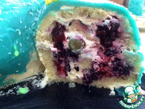 Наполняем торт начинкой. Подравниваем, придаем торту форму, у меня было очень много ягод. Отложенным кремом обмазываем весь торт, чтобы он равномерно пропитался. Накрываем торт ( у меня контейнер специальный) и отправляем в холодильник на несколько часов (у меня ночь простоял). -