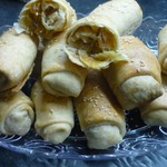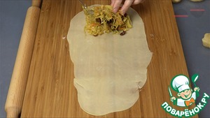 Делю на равные кусочки и очень тонко раскатываю. Накладываю начинку. У меня это тушеная капуста с поджаренными кусочками свинины (мои мальчики без мяса есть отказываются). Заворачиваю рулетики.