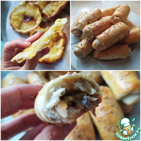 Духовые пирожки-рулетики с большим количеством начинки и тонким слоем вкуснейшего хрустящего теста. На вкус как жареные! Минимальный вред для желудка и для фигуры! Нашла на сайте похожие рецепты, но состав немного другой. Уверена, что многие готовят подобные пирожки. Но тем, кто ни разу это не пробовал, я очень рекомендую заглянуть!