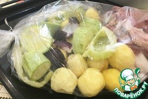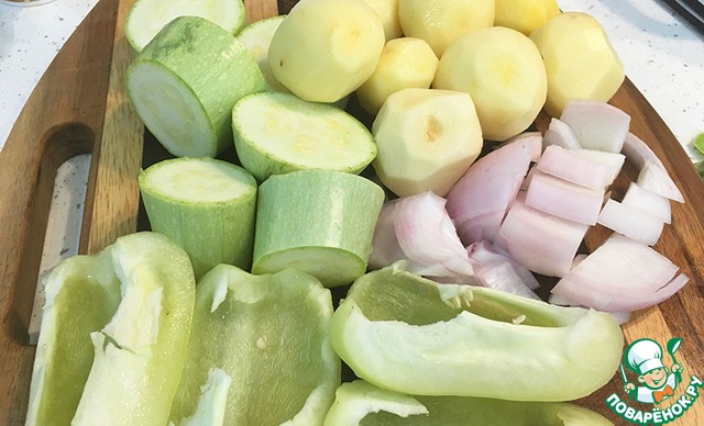 Картофель чистим, кабачок моем и режем крупно. Перец болгарский - на 4 части. Лук также режем крупно. Солим, перчим, добавляем лавровый лист.