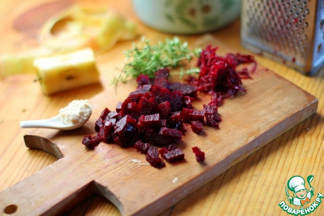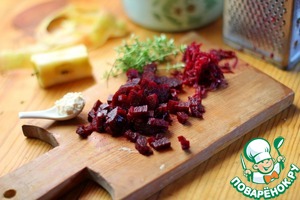 • Треть свёклы потереть на тёрке, а оставшуюся часть порезать кубиком, как и яблоко.
