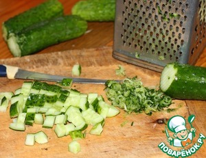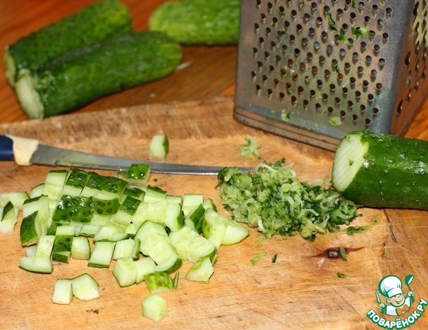 Концы огурца трём на мелкой тёрке, чтоб придать окрошке особый, насыщенный аромат свежести.