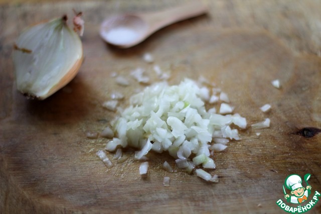 Лук мелко нарезать, присолить и хорошенько промять, можно потолочь толкушкой.
