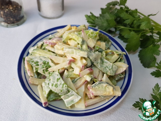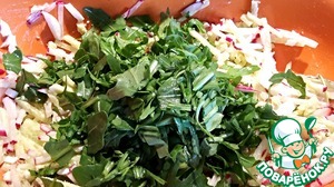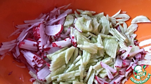 Редис и огурцы нарезаем или натираем на терке некрупной соломкой. Присаливаем по вкусу.