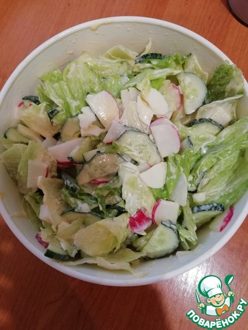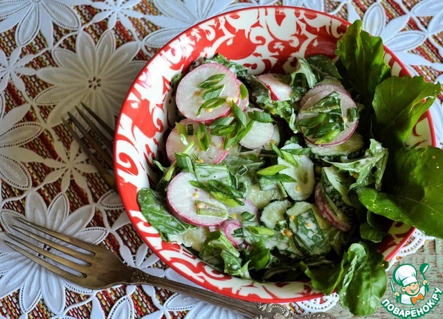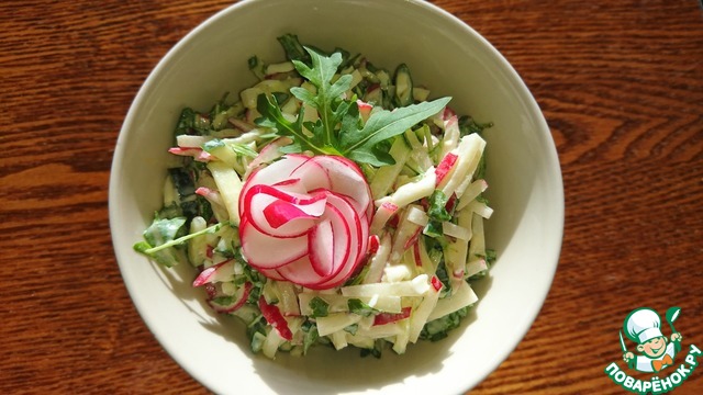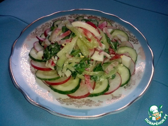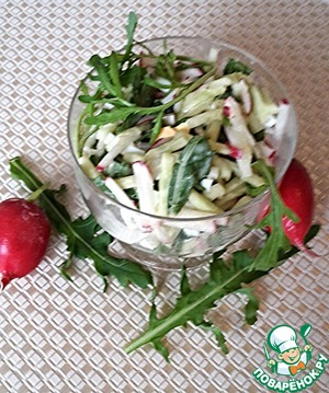 - Ты на ужин гуляш есть будешь? - спросила я у дочки. Детские глаза смотрели на меня с укоризной: - Мама, какой гуляш? Мы же его уже на обед ели!!! "Эх ты, редиска", подумалось мне, "такой гуляш с утра до ночи есть не грех! Хотя про редиску - это мысль". И пошла я в магазин за редиской. Заодно рукколу прихватила, огурчиков, короче, Остапа понесло. И в результате - свежий, легкий, хрустящий, немного девичий салат. Похожие рецепты на сайте есть, но и своим вариантом хочу поделиться, уж больно он нам понравился.