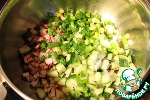 Редис и огурец нарезать мелкими кубиками, добавить нарезанный лук.