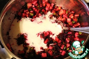 Затем добавить свеклу, натертую на мелкой терке и хрен.