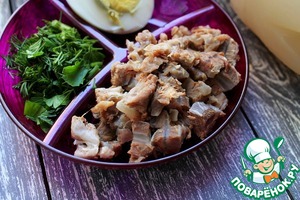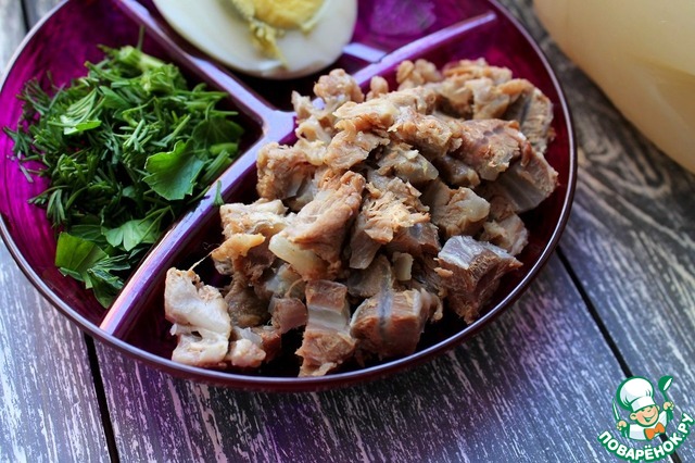 На отдельной тарелке подать яйца, зелень и мясо нарезанное мелкими кубиками.