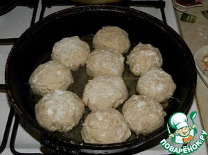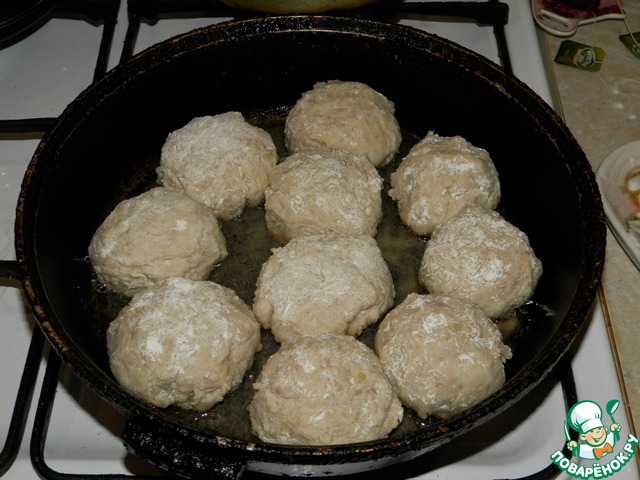 • Сформировать небольшие тефтельки и обвалять их в муке. Обжарить на растительном масле с одной стороны до золотистого цвета.