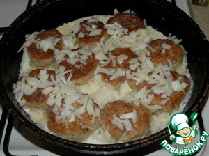 • Тефтели перевернуть, посыпать мелко нарезанным луком, залить молоком и тушить 10 минут на медленном огне, с закрытой крышкой.