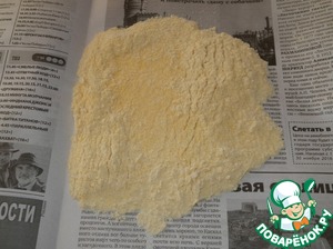 • Смешать пшеничную и пшённую муку, сливочное масло, желтки, ванилин, сахар и настойку (коньяк, водку)