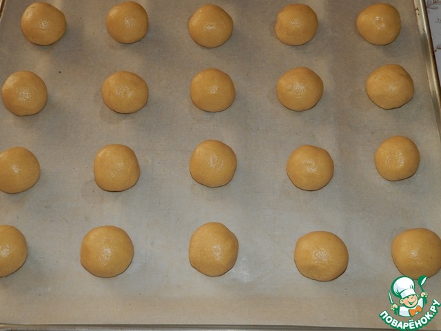 Тесто разделить на небольшие кусочки и скатать из них шарики, величиной с грецкий орех.