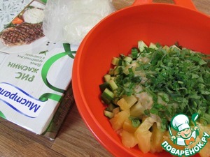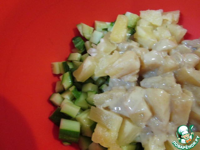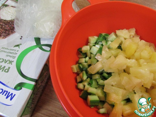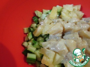 В миске смешать нерезанные огурчики и ананасы.
