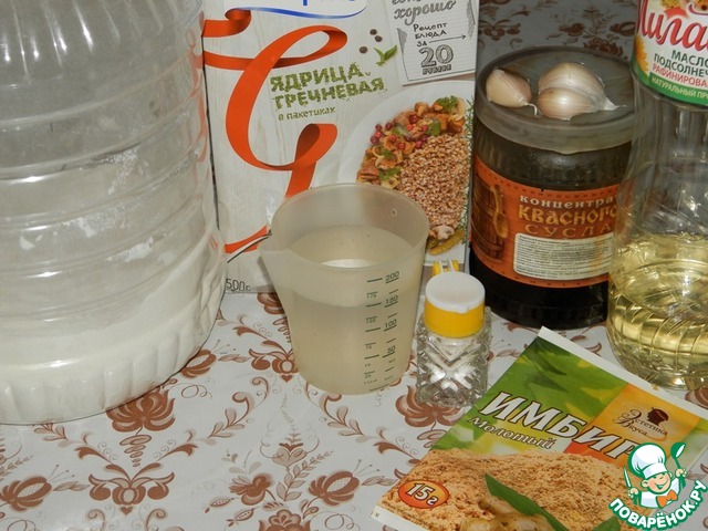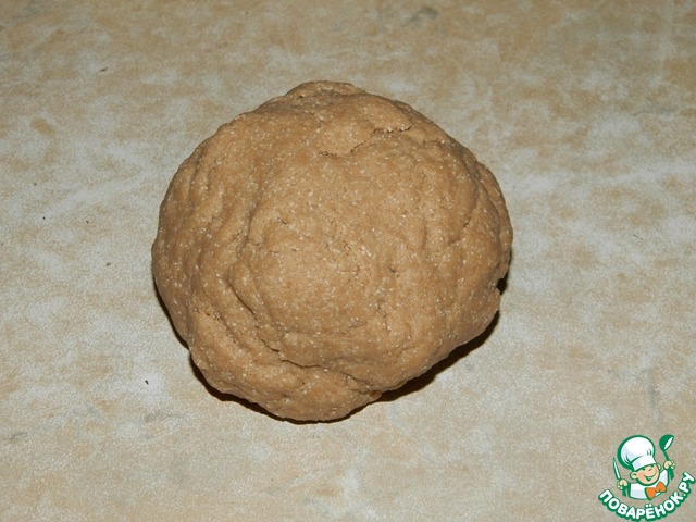 Итак, соединить молотую гречневую крупу, муку, сусло, имбирь, соль, сахар, выдавленный чеснок и перемешать. К этой смеси добавить 4 ст. л. растительного масла и воду, хорошо перемешать. После добавить ещё 2 ст. л. растительного масла и вымесить мягкое эластичное тесто. Оно не должно липнуть к рукам. -