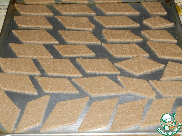 Тесто тонко раскатать, толщиной 2-3 мм. Разрезать на ромбики, прямоугольники или квадратики, как подскажет ваша фантазия.