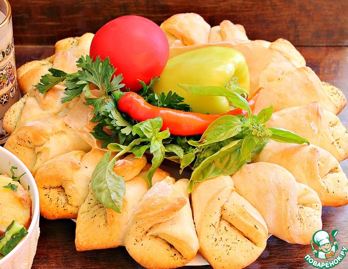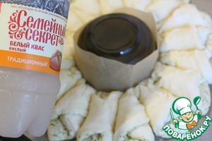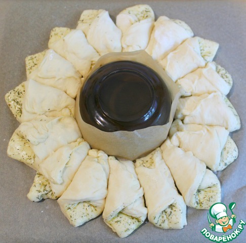 Положить пекарскую бумагу на противень и выложить в круг один к одному кулечки - середина должна быть свободна.