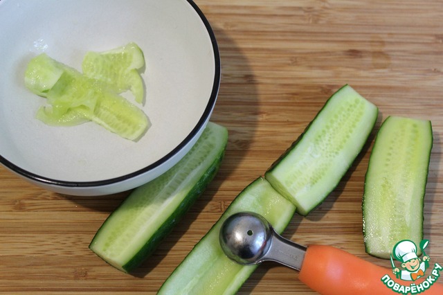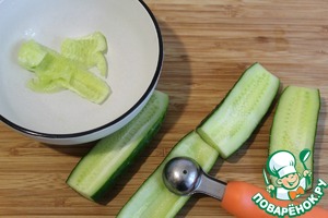 Огурцы разрезать на две части и ложкой вынуть семена с частью мякоти.
