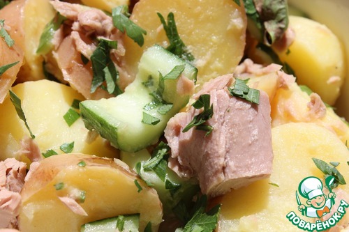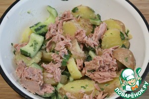 Влить в картошку соус с огурцами, аккуратно перемешать.