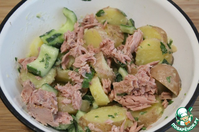 Добавить тунец и еще раз аккуратно перемешать.