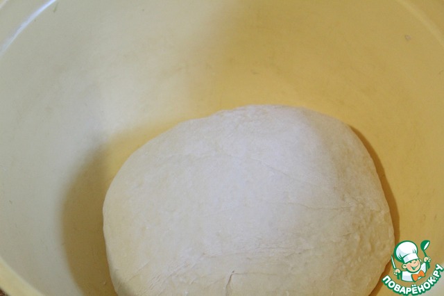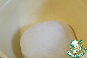 Замесить мягкое и податливое тесто, скатать в шар, положить в емкость, накрыть крышкой и поставить в теплое место на 1,5 часа.