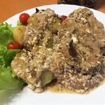 Телятину или молодую говядину порезать на тонкие порционные куски, посолить, поперчить, посыпать прованскими травами и запанировать в муке.