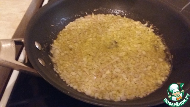Теперь, когда основные подготовительные работы завершены, можно приступить непосредственно к приготовлению ризотто. Лук мелко порезать и обжарить в оливковом масле до прозрачности.
