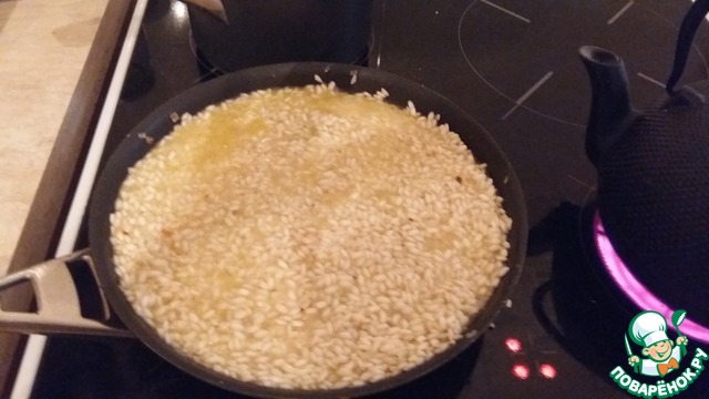 Засыпаем в сковороду рис и тоже его обжариваем. Добавляем вино и даем ему полностью выпариться. Вино может быть от сухого до полусладкого, но важно, что бы оно было хорошего качества и нравилось Вам на вкус.