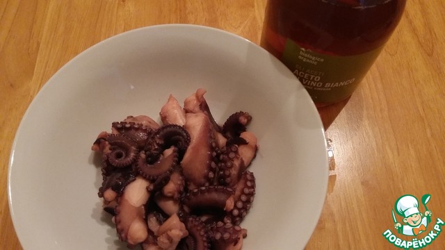 Настало время довести до полной готовности осьминога. Вот так он выглядит в варенном виде. Выкладываем его на, смазанную оливковым маслом сковородку, и поливаем 1 - 2 ст. л. виноградного уксуса. Обжариваем пару минут до полного выпаривания уксуса. В результате этого не хитрого действия осьминог получается мягко - упругим, но не жестким и не резиновым.