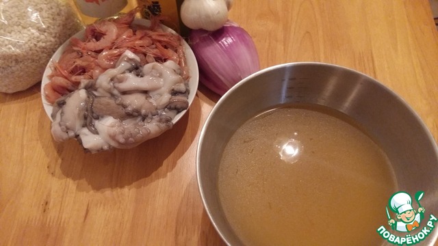 Это основные ингредиенты. Сегодня утром был не слишком удачный улов. В результате мне достались мелкие креветки и маленький осьминог весом 500 гр. Осьминога мне разделали непосредственно при покупке. Хочу Вас предупредить, что 2 стакана /по 250 мл./ это слишком много риса для такого количества морепродуктов, но он получился таким вкусным, что был с большим удовольствием съеден на следующий день в качестве гарнира к жареной рыбе.