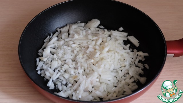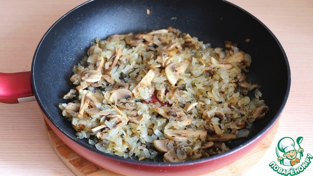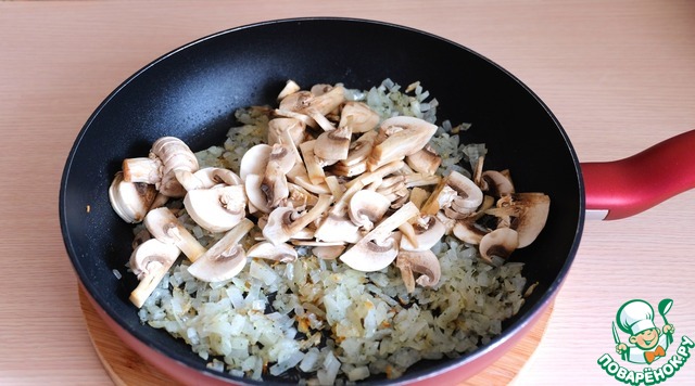 Добавляем к пассерованному луку пластики грибов, ставим на огонь, обжариваем на легком огне вместе с луком. В конце добавляем пряную зелень.
