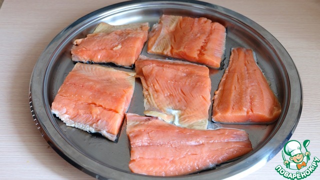 Режем филе горбуши крупными кусочками, примерно 10х10 см.