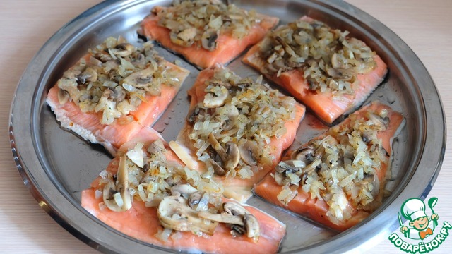 Выкладываем на кусочки филе горбуши луково-грибную смесь.
