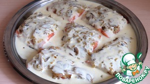 Яично - майонезной смесью покрываем кусочки филе горбуши. Отправляем в духовой шкаф для запекания.