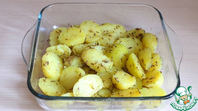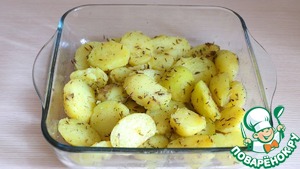 Порезанные пластики картофеля выложить в форму для запекания, приготовленной смесью равномерно покрыть картофель. Включить в духовке гриль и подрумянить картофель.