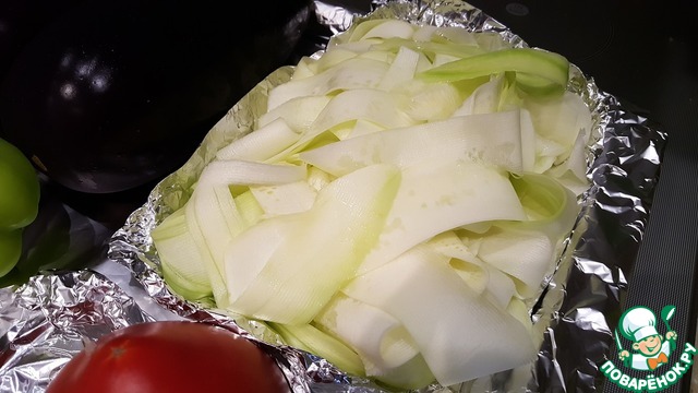 Из фольги сделать лоток, капнуть немного растительного масла и выложить кабачок.