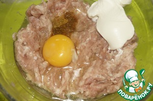 • В фарш добавить сметану, 1 яйцо, приправу и соль, хорошо вымесить фарш.
