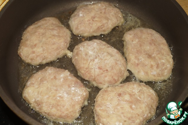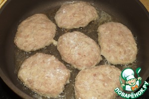 • Из фарша сформировать котлетки, обвалять в муке или панировочных сухарях и обжарить с двух сторон на растительном масле до готовности.