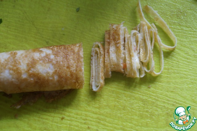 Затем свернуть блинчик рулетом и нарезать тонкой соломкой.