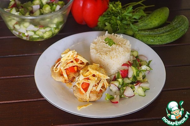 • Подавать следующим образом: выложить отдельно рис, затем рядом котлеты, на каждую котлету выложить немного овощной начинки, затем немного яичного блинчика.