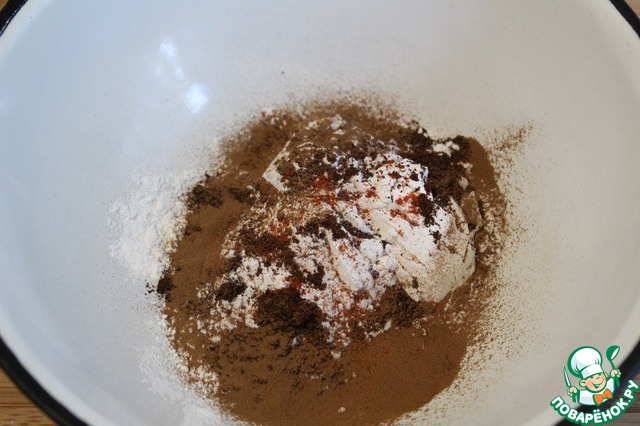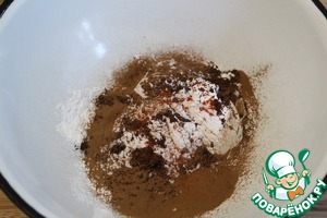 В просеянную муку всыпать сахарную пудру, перец, растворимый кофе, натуральный кофе, молотые орехи, смешать