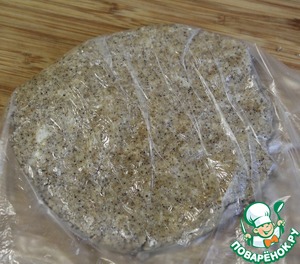 Быстро скатать тесто в шар, приплюснуть, завернуть в пленку и убрать в морозилку на 10 минут.