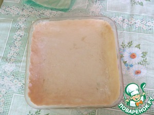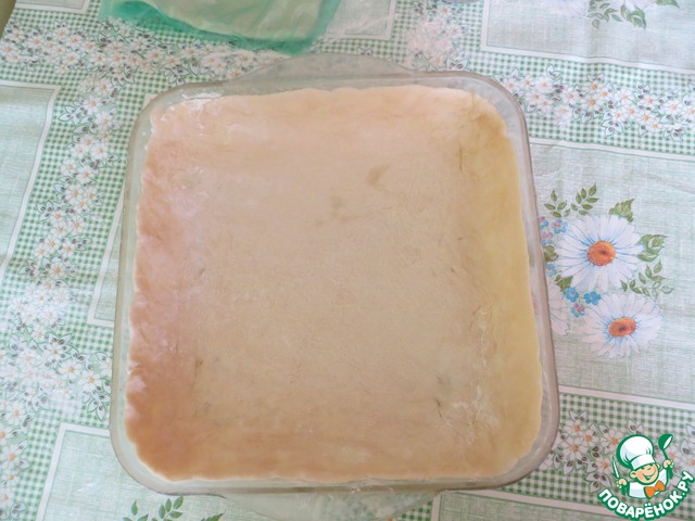 Форму смазать маслом, тесто разделить на две части (вторая должна быть чуть меньше) раскатать тесто. В идеале блюдо подают порционно, в маленьких формах, но у меня столько форм не нашлось на даче и я решила приготовить один большой пирог.