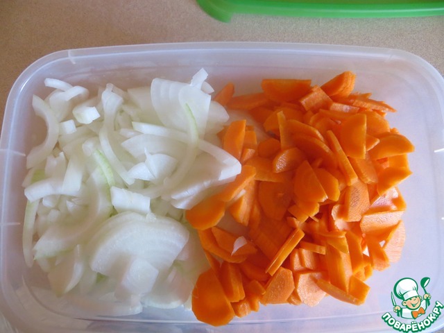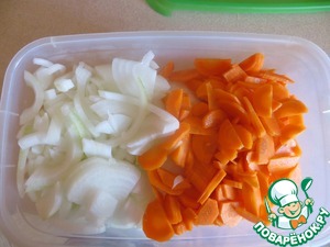 Лук и морковь нарезать полукольцами.