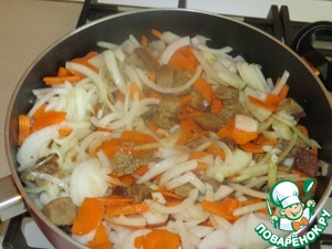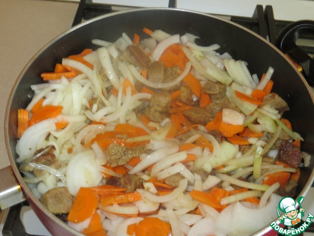 Добавить к мясу лук и морковь