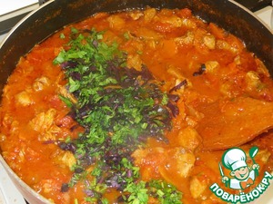 Тушить пока блюдо не загустеет и добавить зелень.