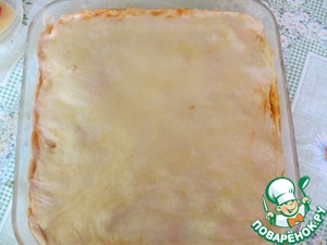 Выложить начинку и сверху накрыть вторым листом теста, бока прижать, смазать смесью яйца и молока.