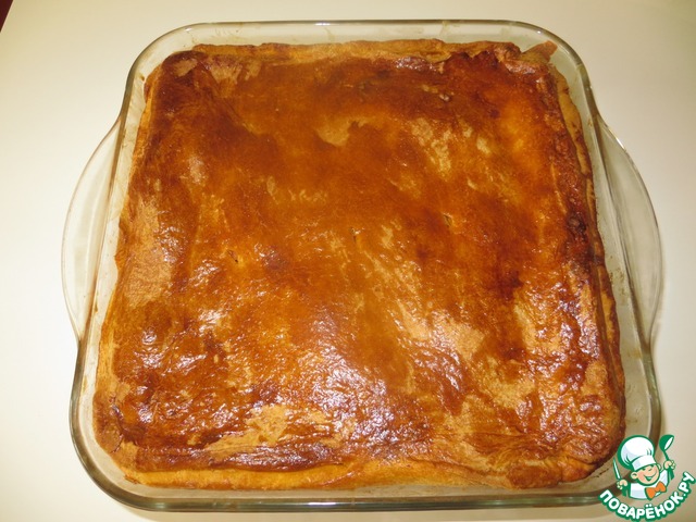 Выпекать в разогретой до 180* духовке, пока сверху пирог не зарумянится. Пирог подавать теплым. Приятного аппетита.